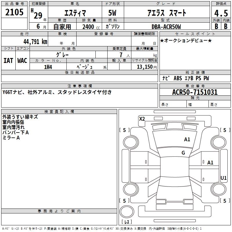 TOYOTA ESTIMA 2017 г., лот № 2105