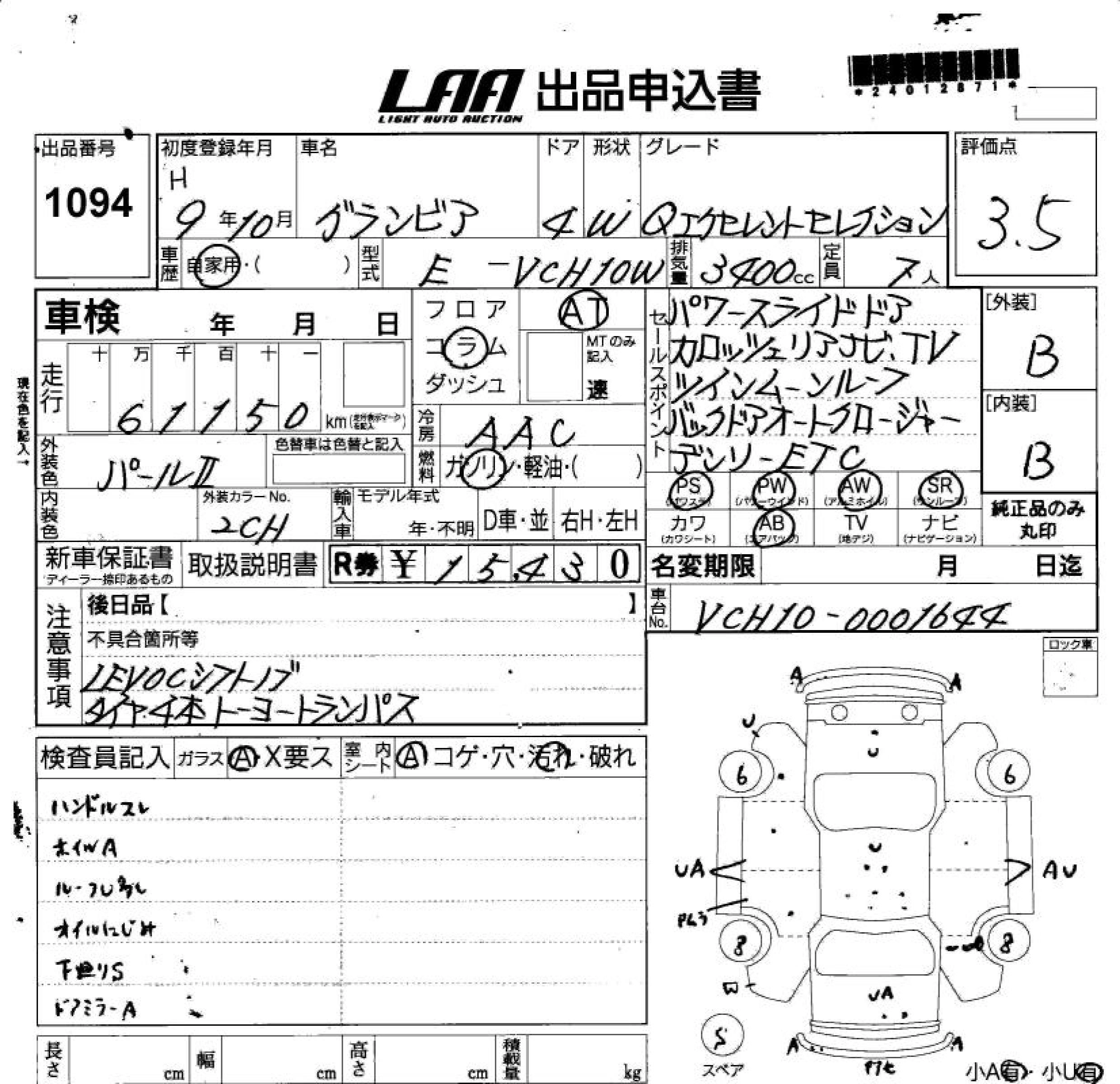 TOYOTA GRANVIA 1997 г., лот № 1094
