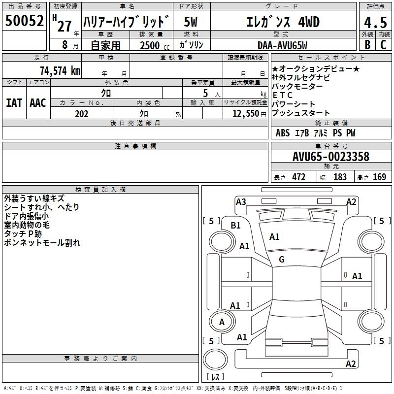 TOYOTA HARRIER HYBRID 2015 г., лот № 50052