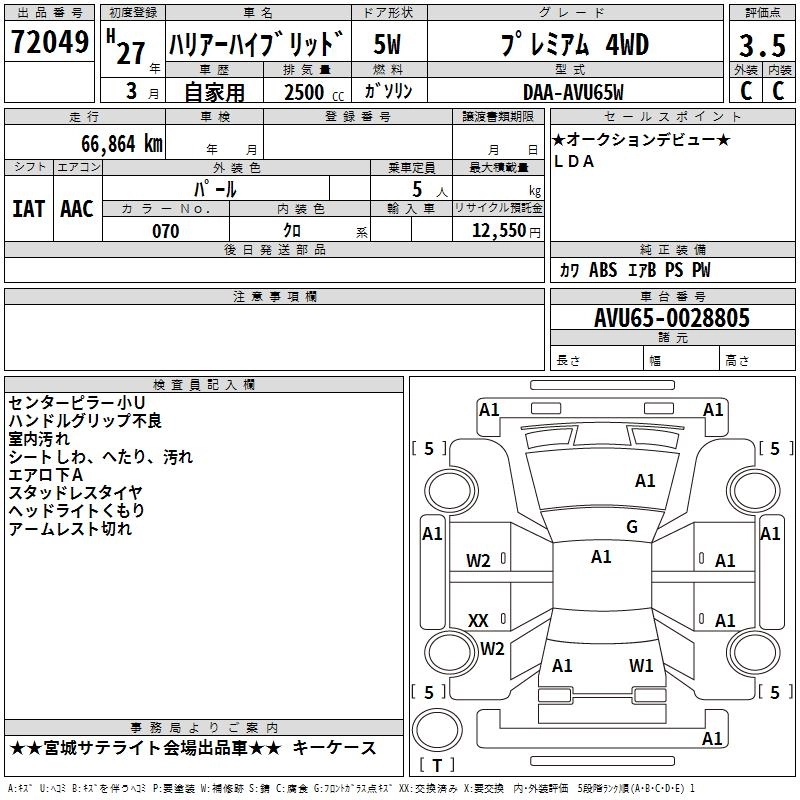 TOYOTA HARRIER HYBRID 2015 г., лот № 72049