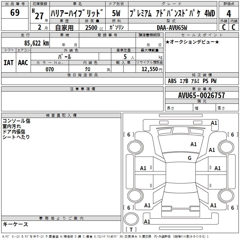 TOYOTA HARRIER HYBRID 2015 г., лот № 69
