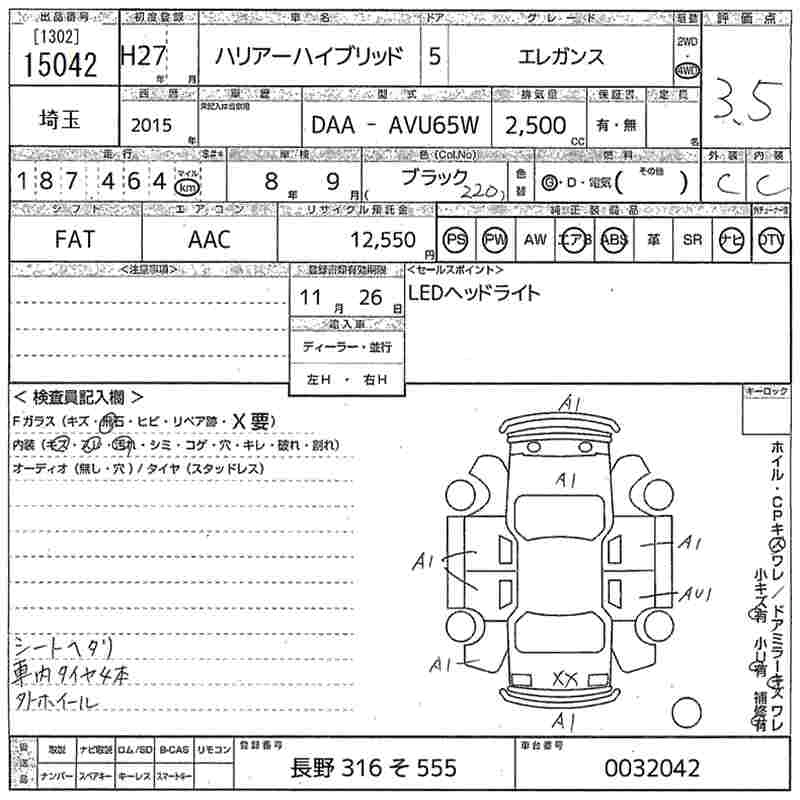 TOYOTA HARRIER 2015 г., лот № 15042