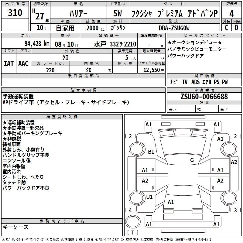 Год выпуска2015 Пробег 94 000 км КузовZSU60W Комплектация WELLFARE CAR PREMIUM ADVAN P