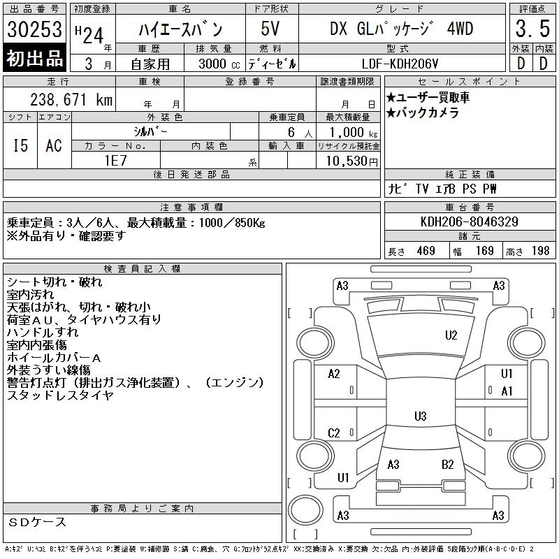 Год выпуска2012 Пробег 239 000 км КузовKDH206V КомплектацияDX GL PACKAGE 4WD