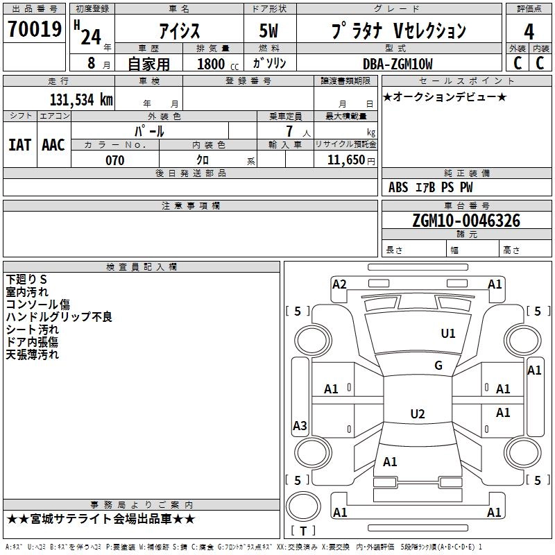 Год выпуска2012 Пробег 132 000 км КузовZGM10W Комплектация PLATANA V SELECTION
