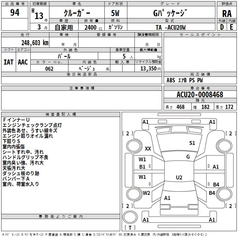 TOYOTA KLUGER 2001 г., лот № 94