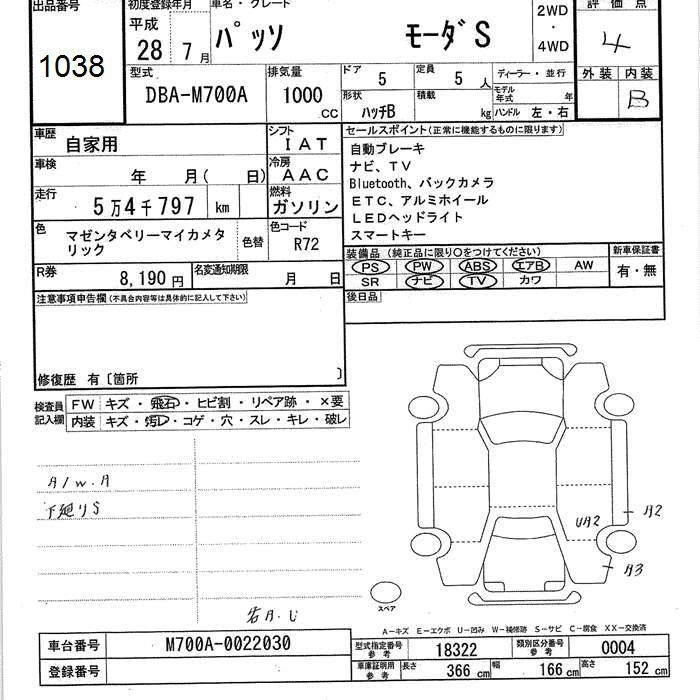 TOYOTA PASSO 2016 г., лот № 1038