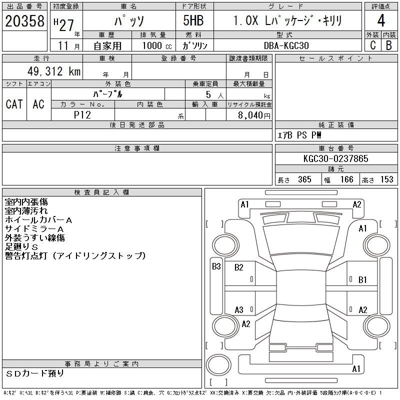TOYOTA PASSO 2015 г., лот № 20358