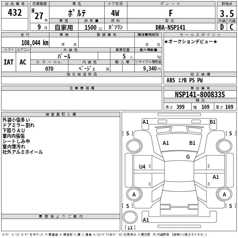 TOYOTA PORTE 2015 г., лот № 432