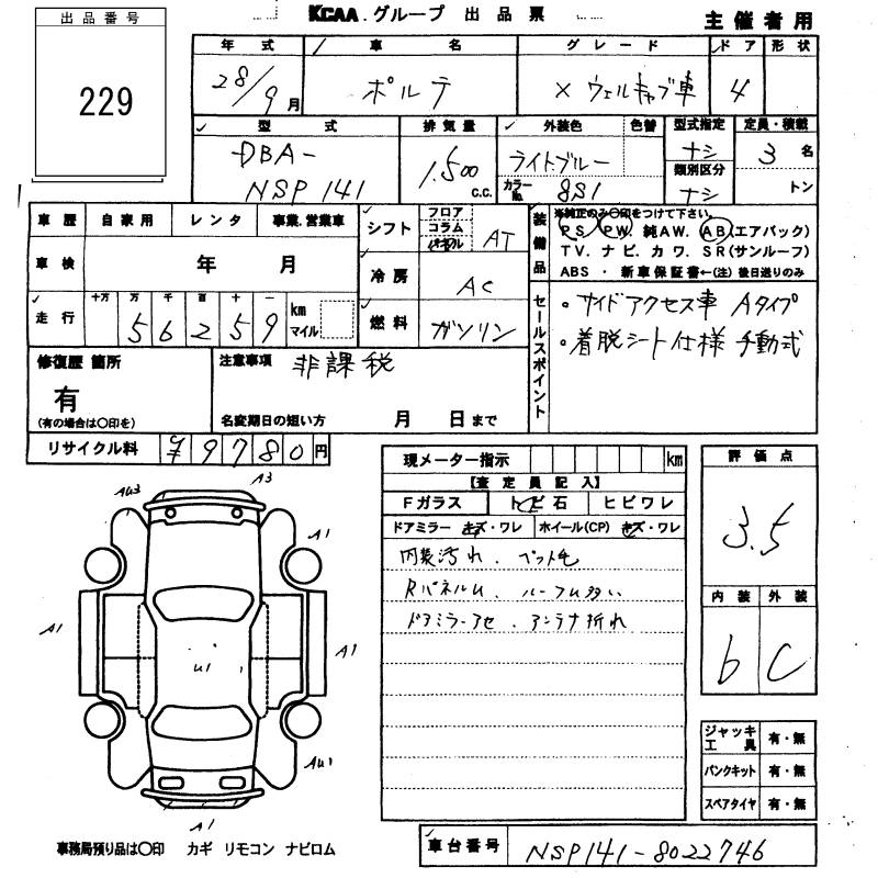 TOYOTA PORTE 2016 г., лот № 229