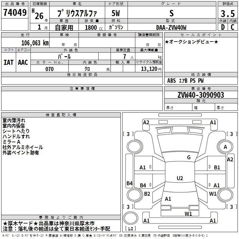TOYOTA PRIUS ALPHA 2014 г., лот № 74049