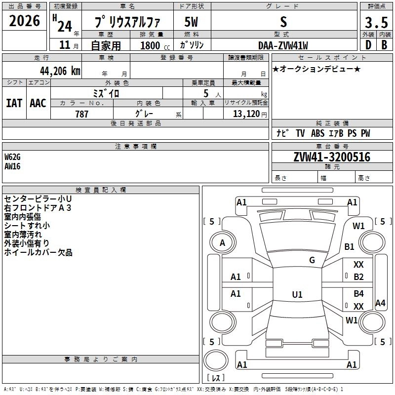 TOYOTA PRIUS ALPHA 2012 г., лот № 2026