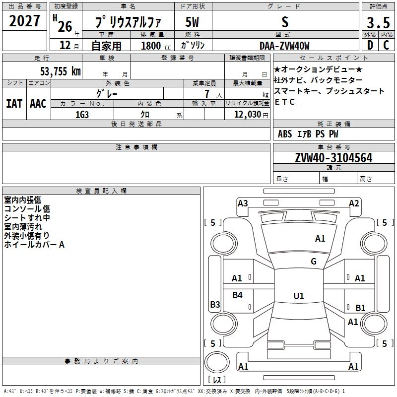 TOYOTA PRIUS ALPHA 2014 г., лот № 2027