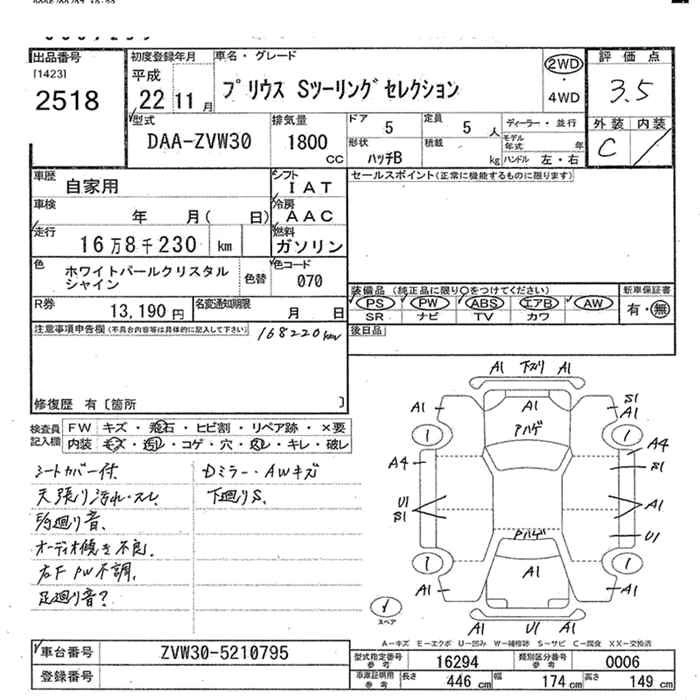 Год выпуска2010 Пробег 168 000 км КузовDAA-ZVW30 КомплектацияS TOURING SELECTION 2WD