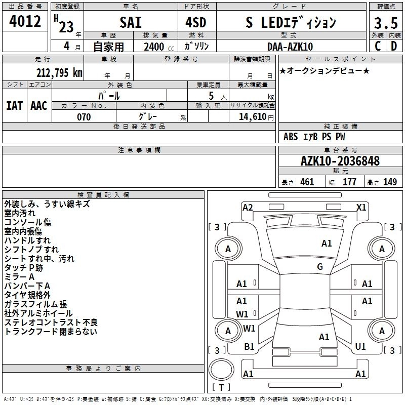 TOYOTA SAI 2011 г., лот № 4012