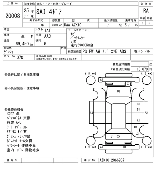 TOYOTA SAI 2013 г., лот № 20008