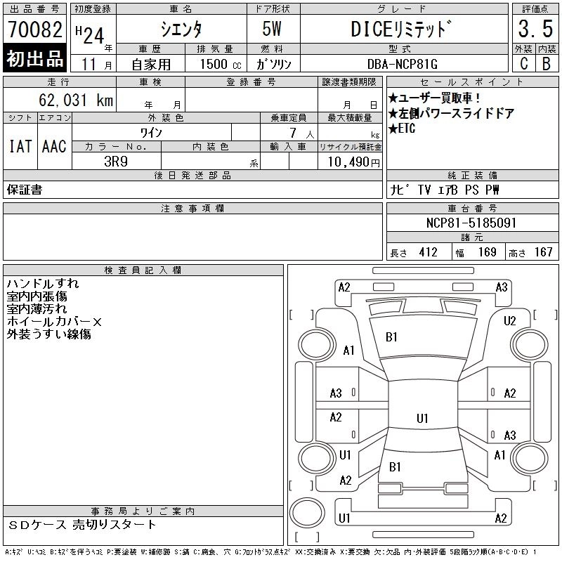 TOYOTA SIENTA 2012 г., лот № 70082