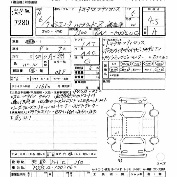 TOYOTA SIENTA 2024 г., лот № 7280
