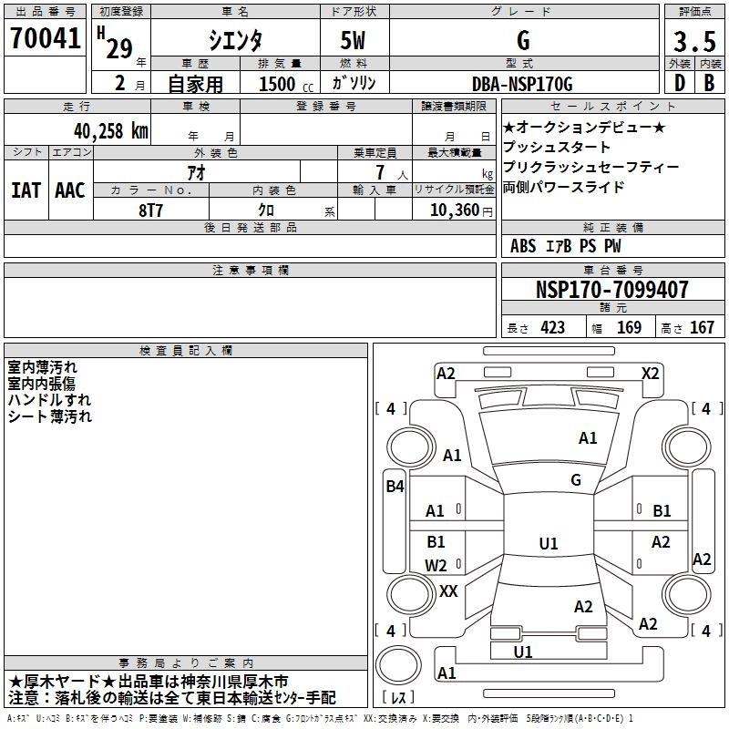 TOYOTA SIENTA 2017 г., лот № 70041