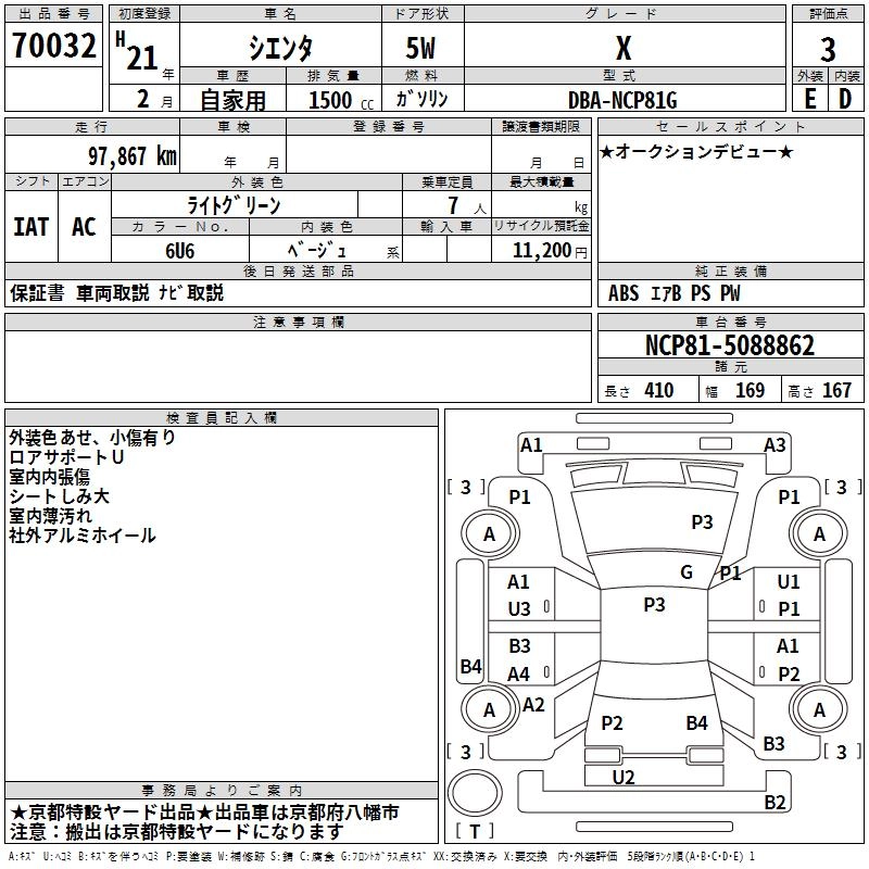 TOYOTA SIENTA 2009 г., лот № 70032