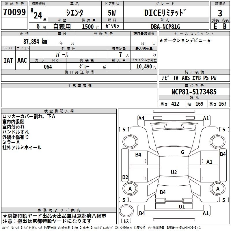 TOYOTA SIENTA 2012 г., лот № 70099
