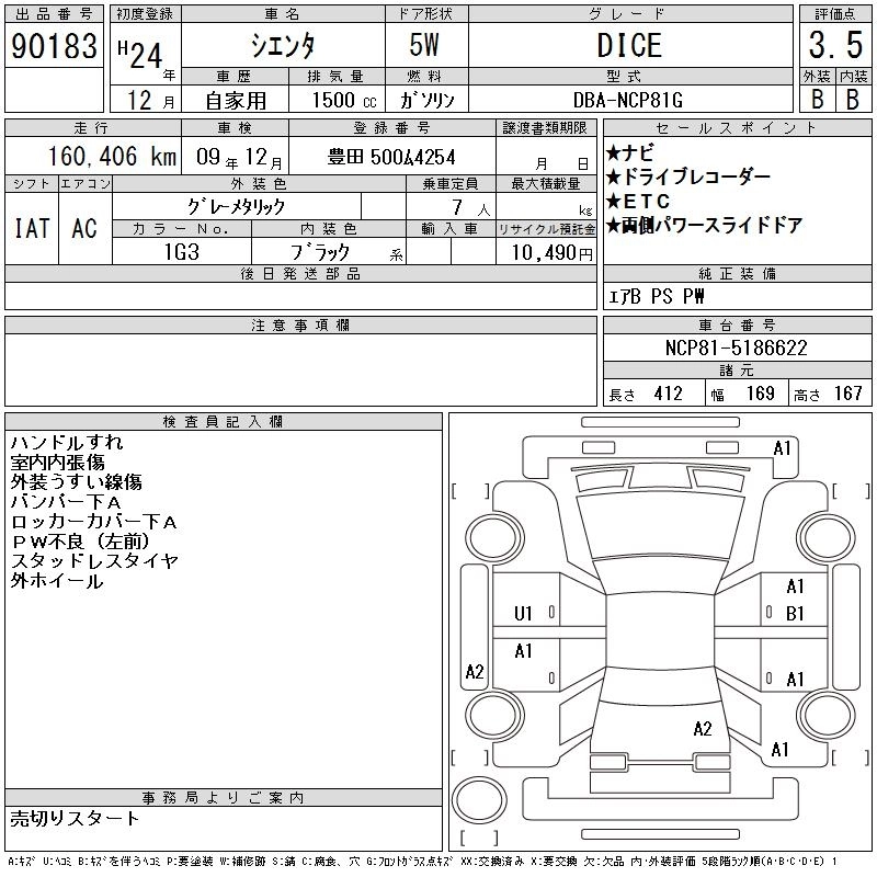 TOYOTA SIENTA 2012 г., лот № 90183