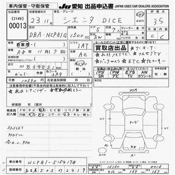 TOYOTA SIENTA 2011 г., лот № 13