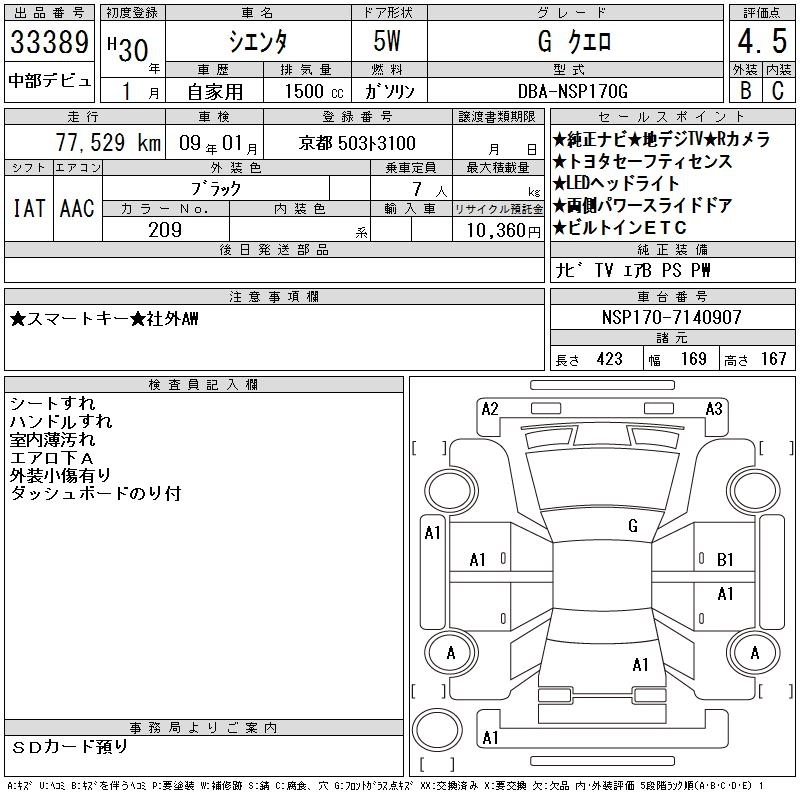 TOYOTA SIENTA 2018 г., лот № 33389