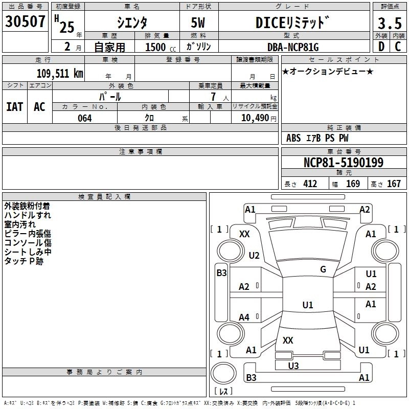 TOYOTA SIENTA 2013 г., лот № 30507