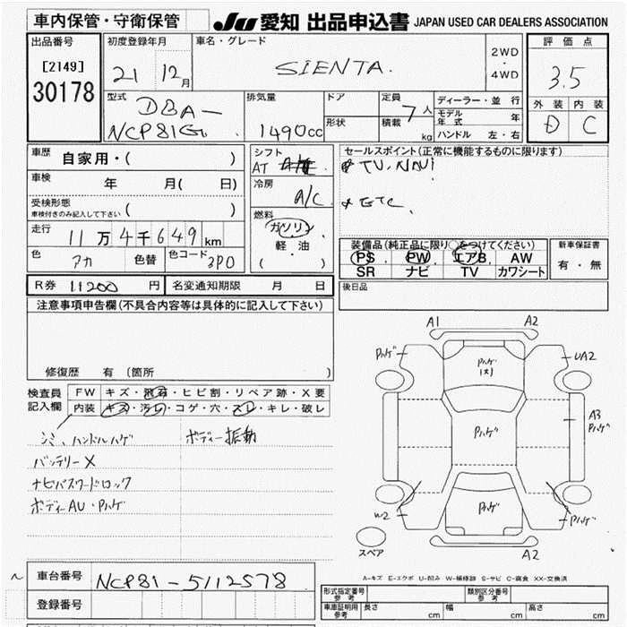 TOYOTA SIENTA 2009 г., лот № 30178
