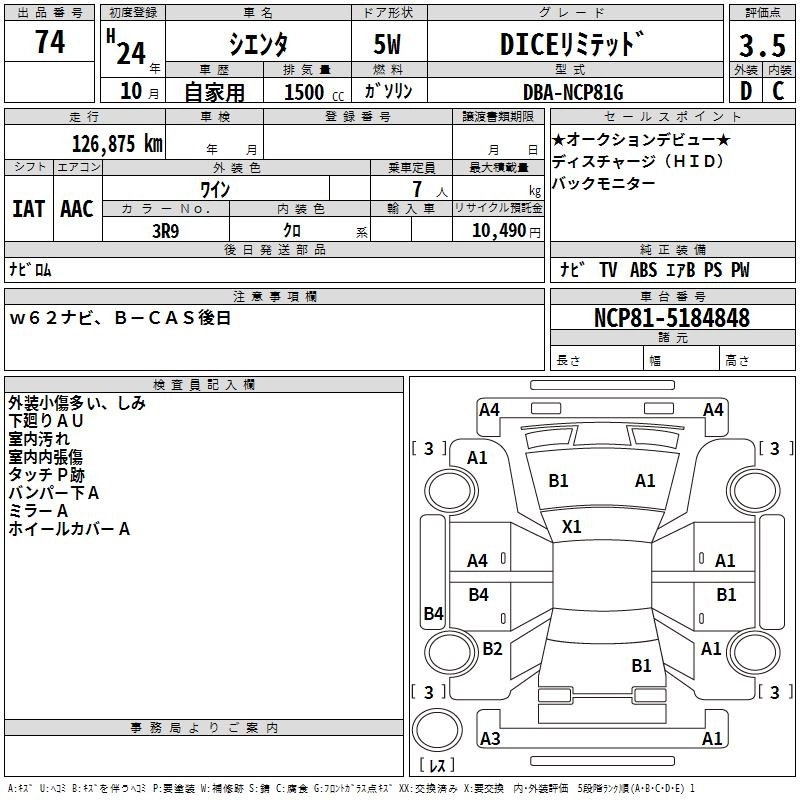 TOYOTA SIENTA 2012 г., лот № 74