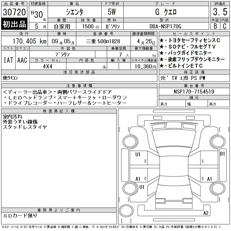 TOYOTA SIENTA 2018 г., лот № 30720