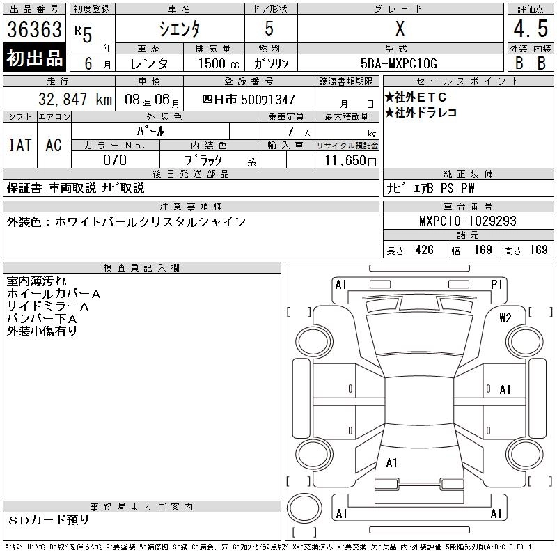 TOYOTA SIENTA 2023 г., лот № 36363