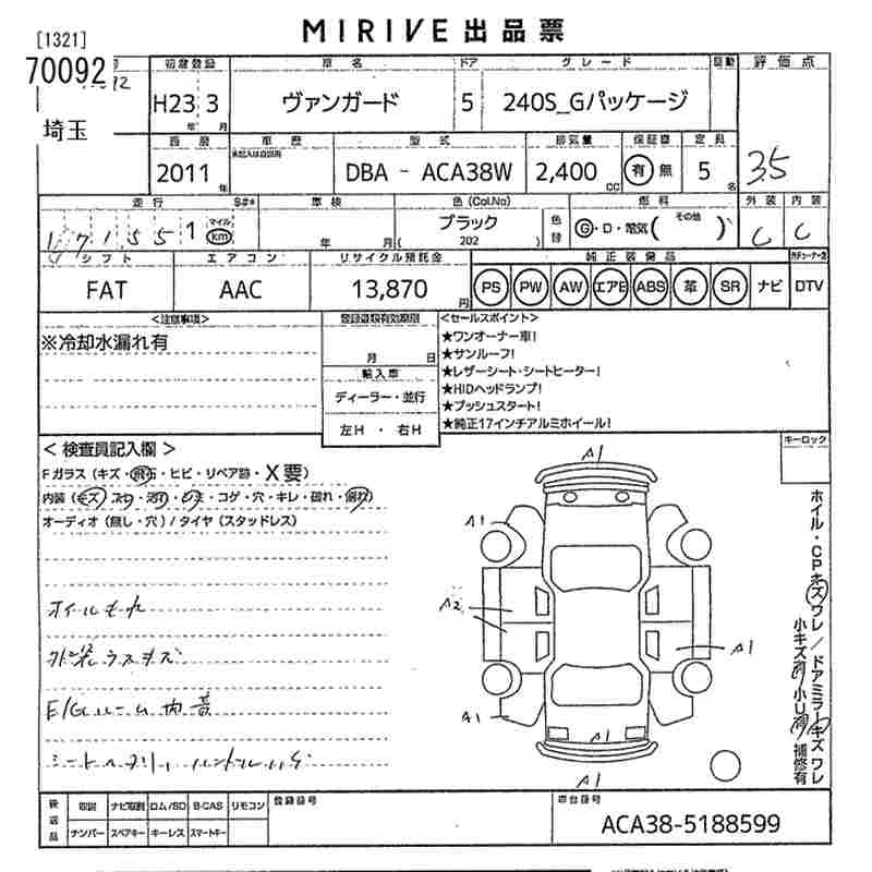 TOYOTA VANGUARD 2011 г., лот № 70092
