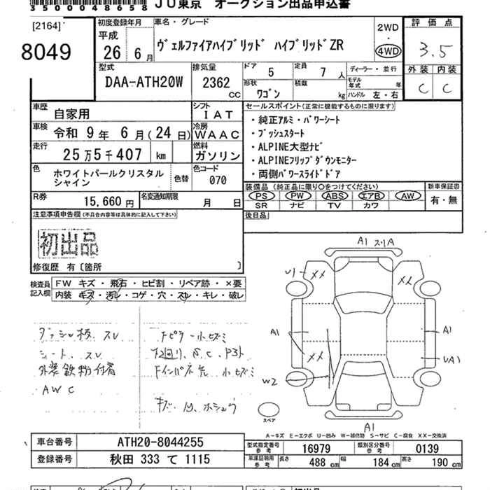 TOYOTA VELLFIRE 2014 г., лот № 8049