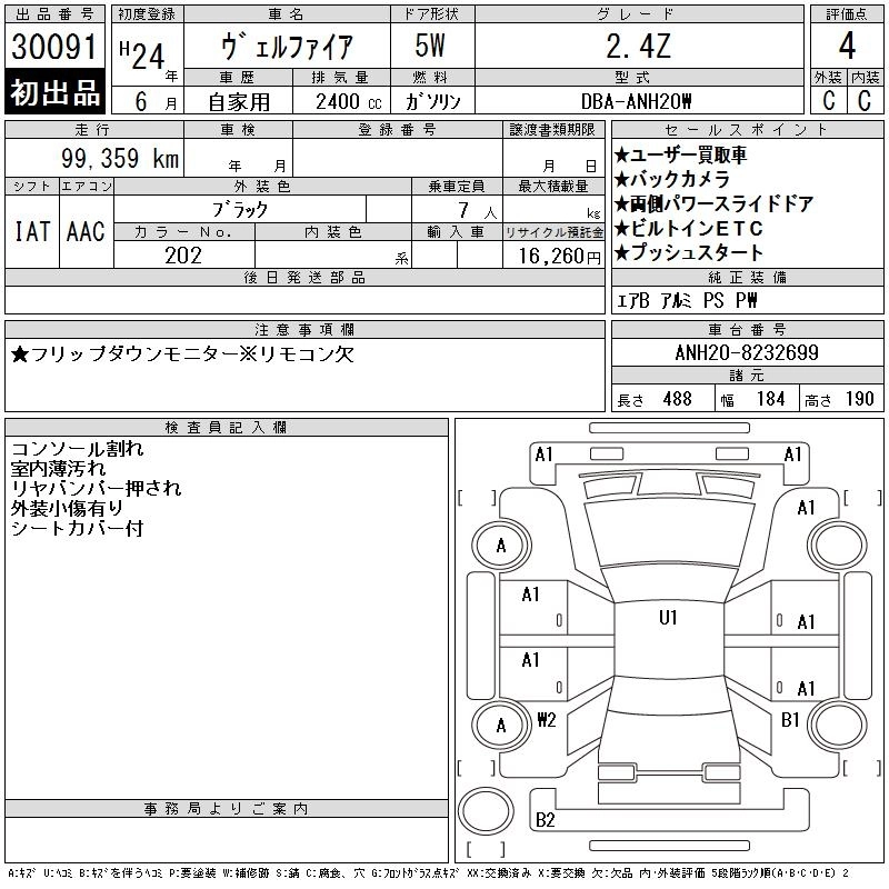 TOYOTA VELLFIRE 2012 г., лот № 30091