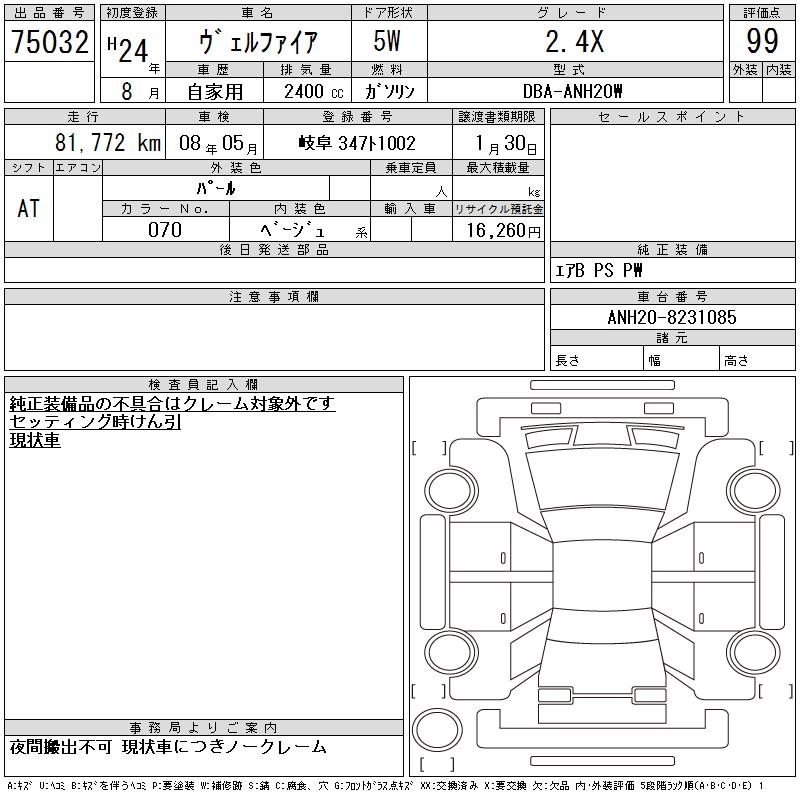 TOYOTA VELLFIRE 2012 г., лот № 75032