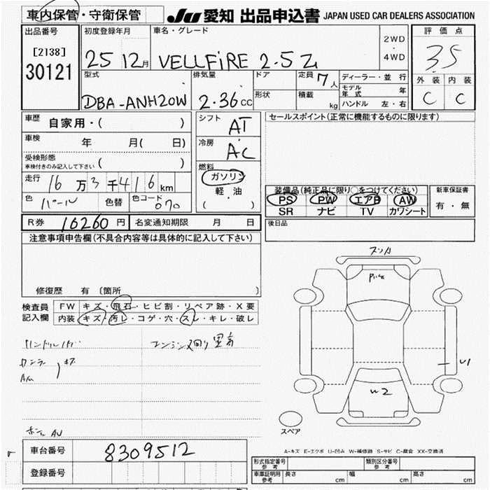 TOYOTA VELLFIRE 2013 г., лот № 30121