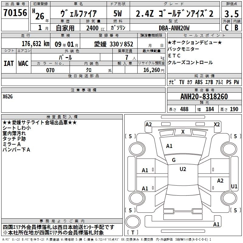 TOYOTA VELLFIRE 2014 г., лот № 70156