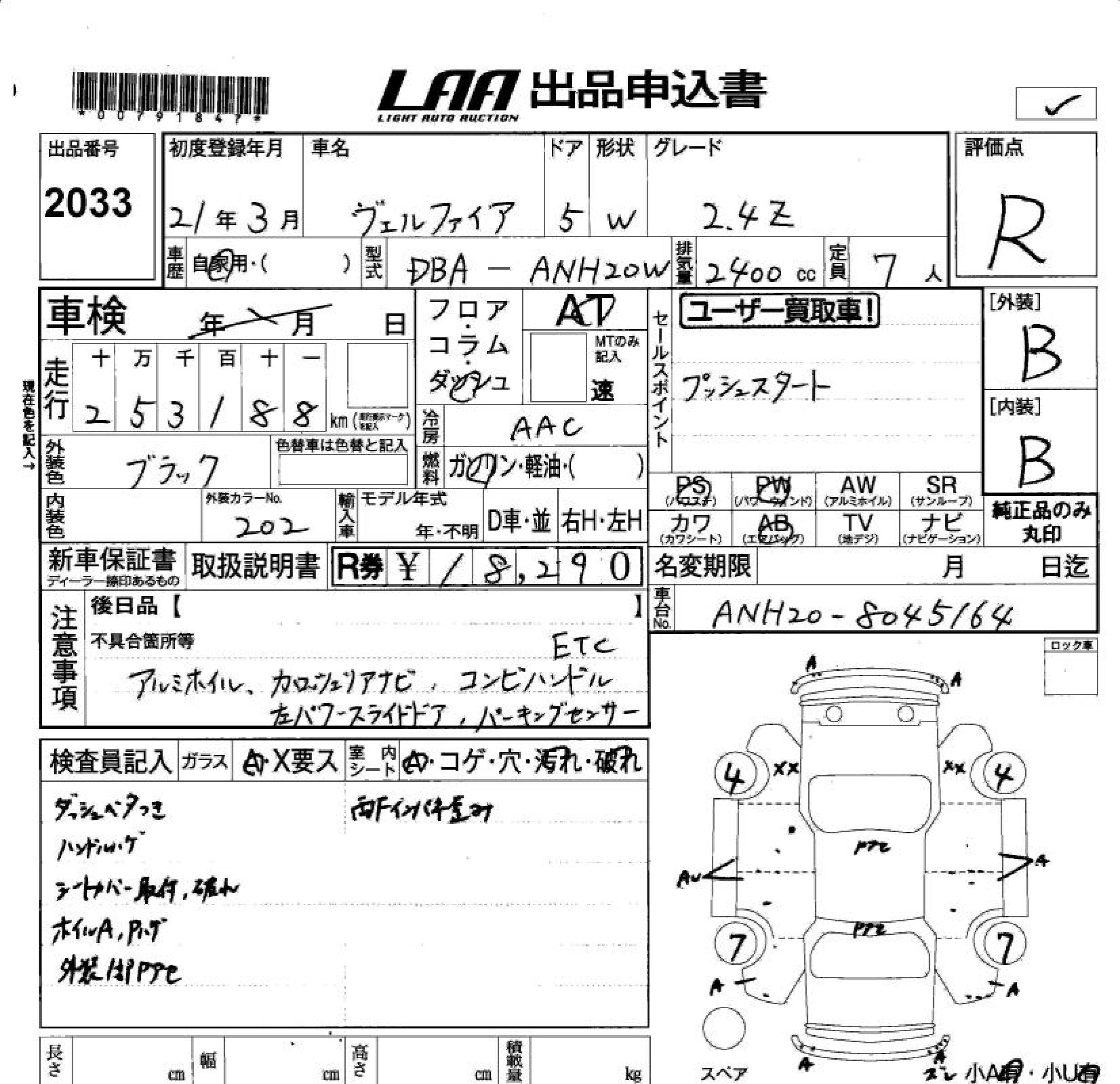 TOYOTA VELLFIRE 2009 г., лот № 2033