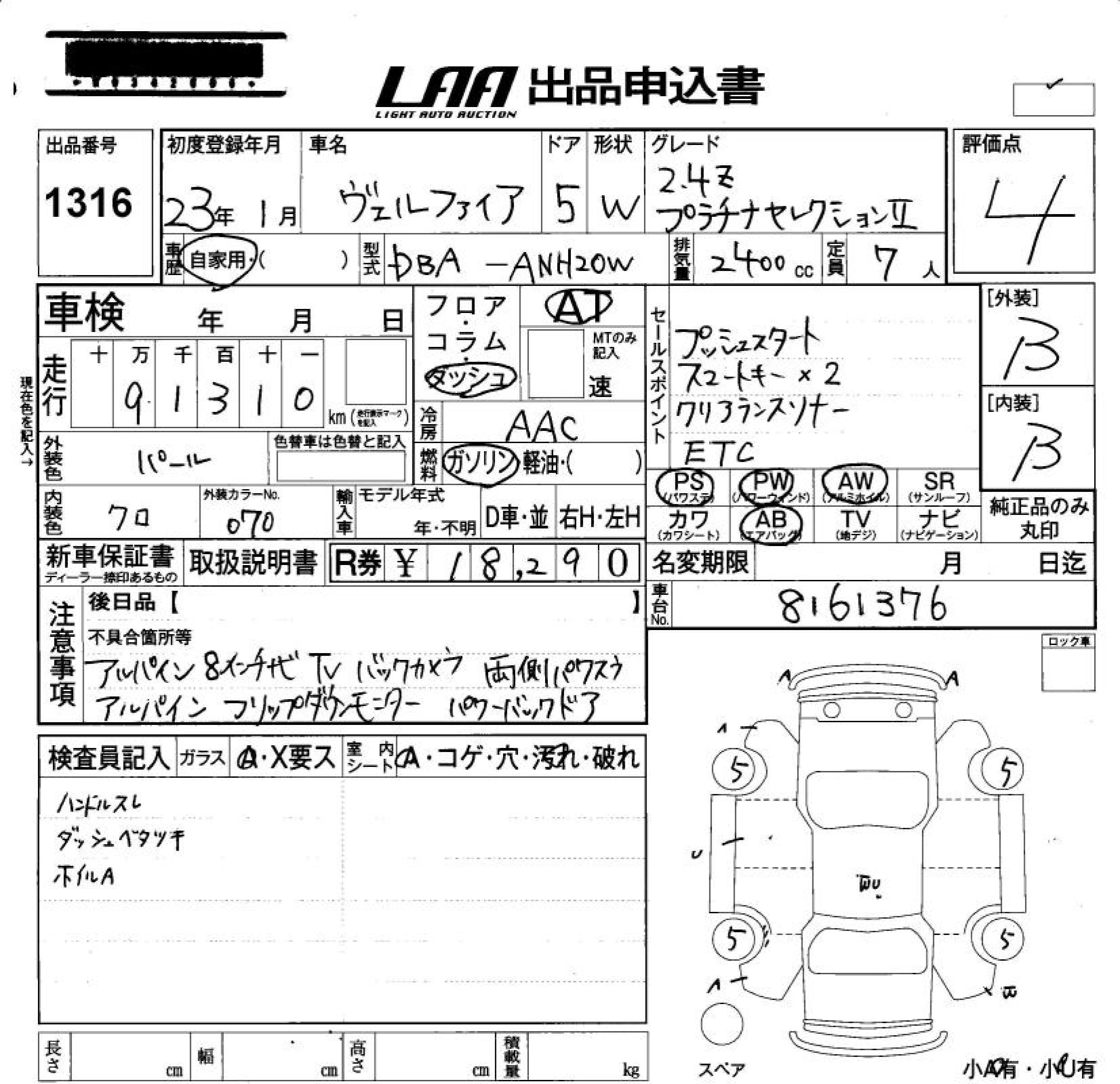 TOYOTA VELLFIRE 2011 г., лот № 1316