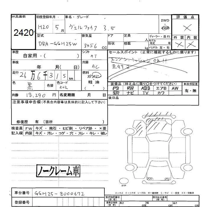 TOYOTA VELLFIRE 2008 г., лот № 2420