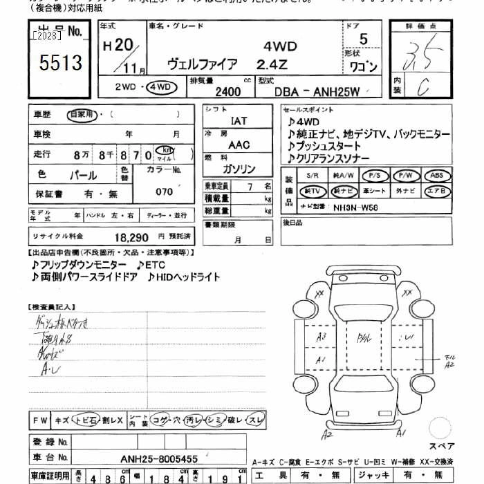 TOYOTA VELLFIRE 2008 г., лот № 5513