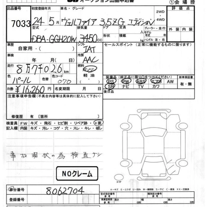 TOYOTA VELLFIRE 2012 г., лот № 7033