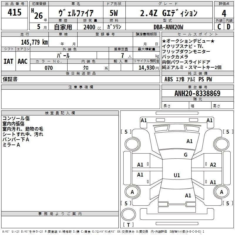 TOYOTA VELLFIRE 2014 г., лот № 415