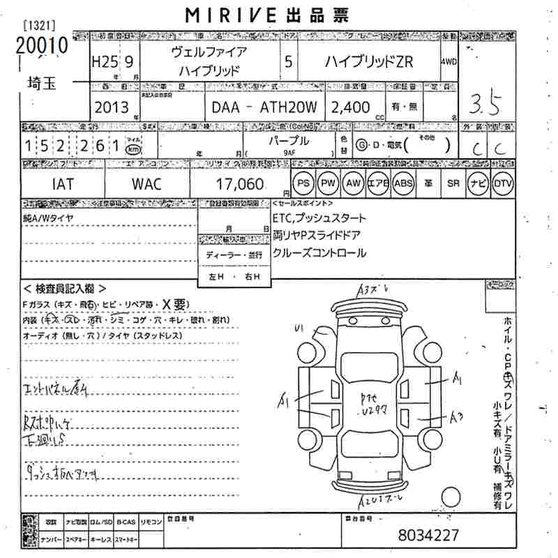 TOYOTA VELLFIRE 2013 г., лот № 20010