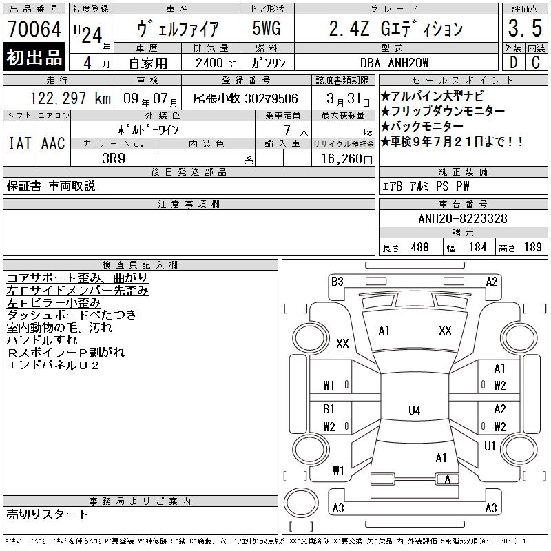 TOYOTA VELLFIRE 2012 г., лот № 70064