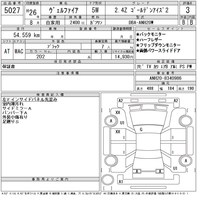 TOYOTA VELLFIRE 2014 г., лот № 5027