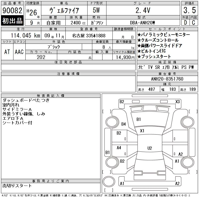 TOYOTA VELLFIRE 2014 г., лот № 90082