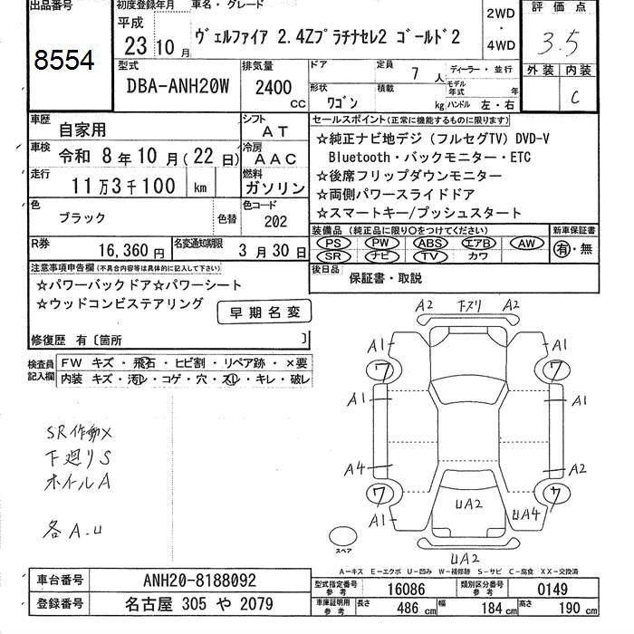 TOYOTA VELLFIRE 2011 г., лот № 8554